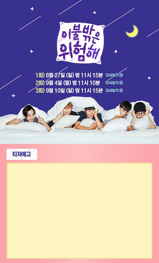 《被子外面很危险》为韩国MBC的综艺节目,由龙俊亨、姜丹尼尔、Xiumin、李尚禹、朴载正等人共同主持,是一档围绕被称为“宅男”的男艺人们的休假真人秀。没什么兴趣爱好只能宅在家中的韩流明星、害怕走出...